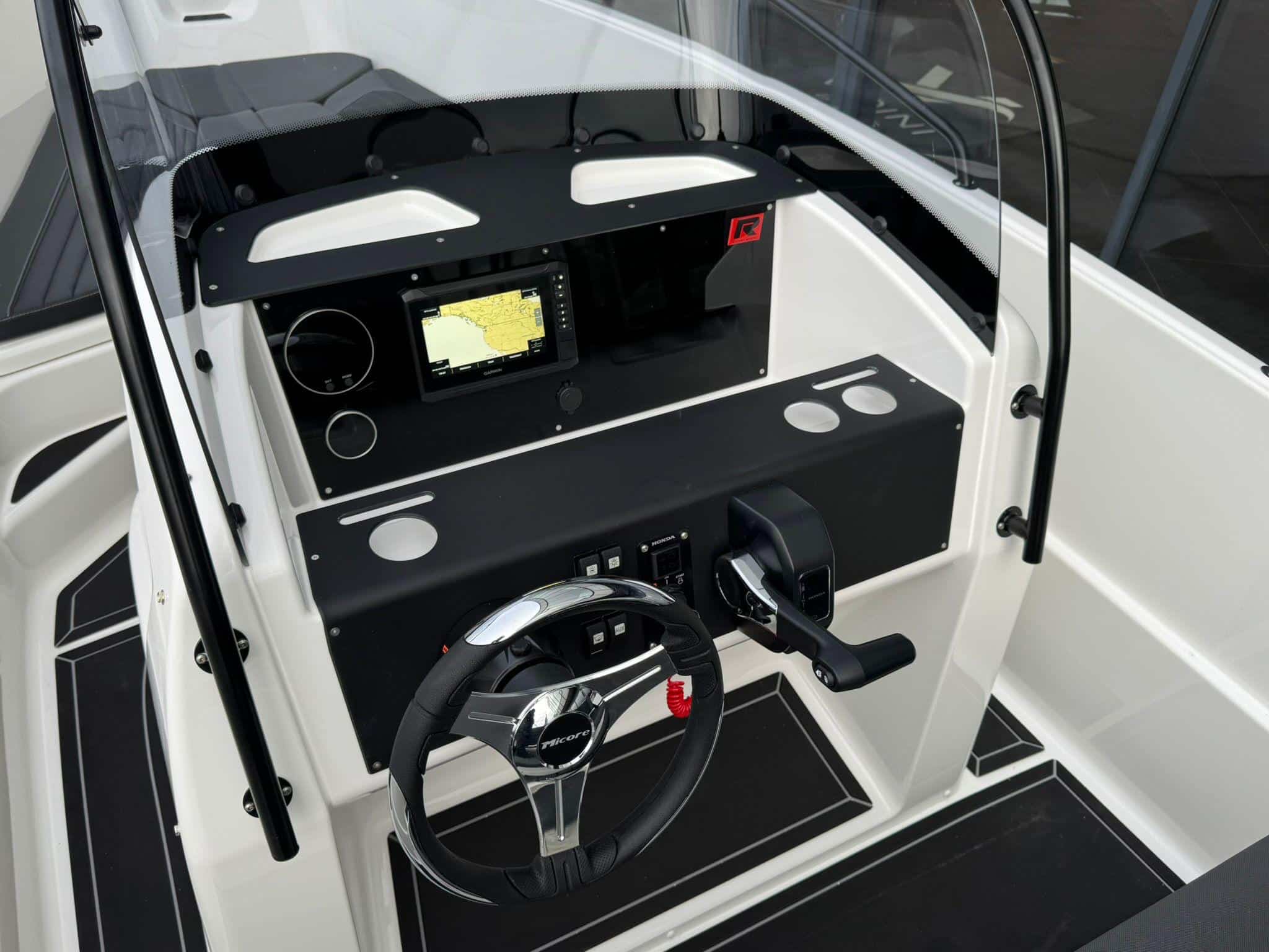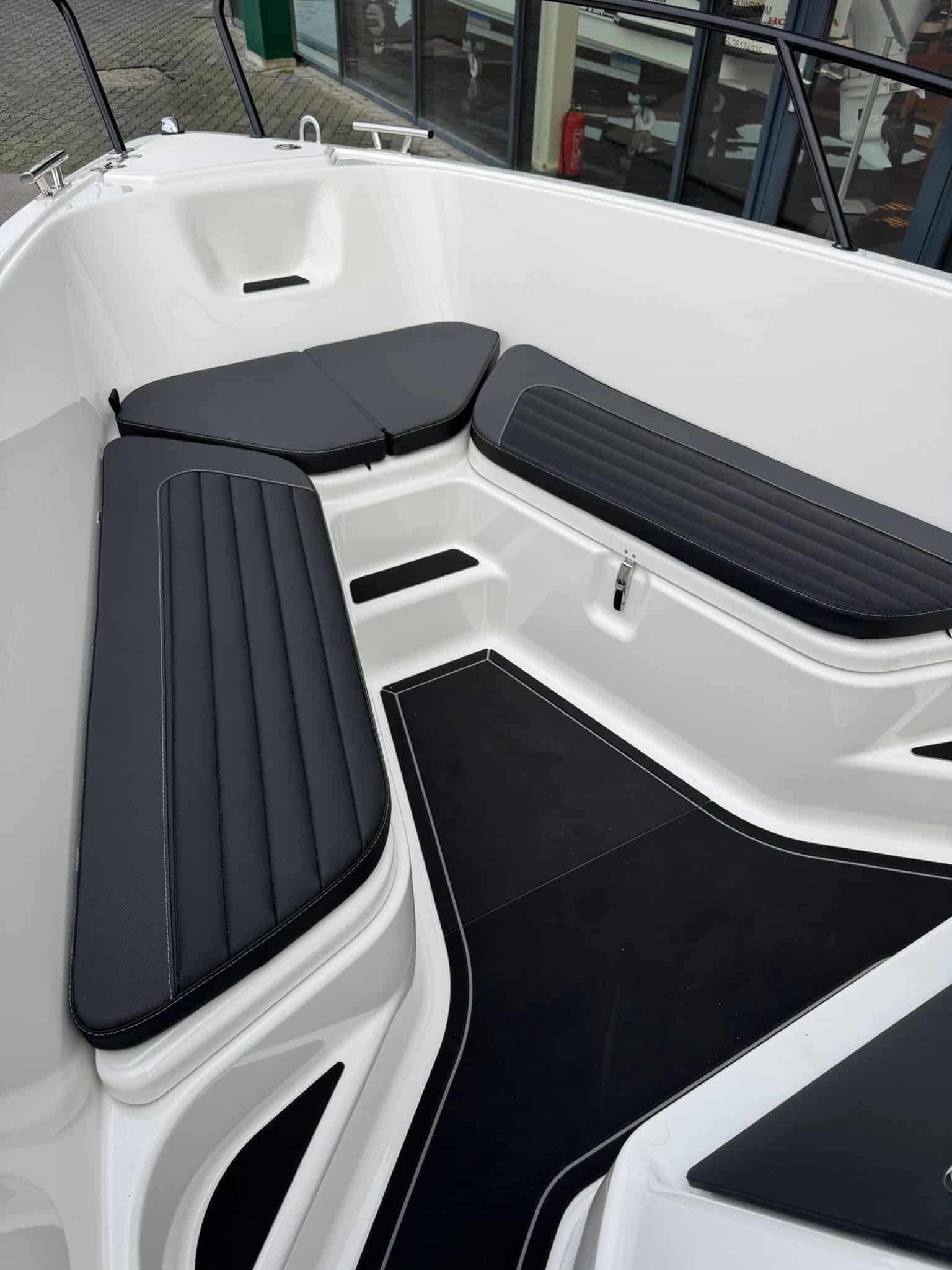 De boot biedt plaats aan maximaal zes personen en is voorzien van luxe donkergrijze bekleding, een ruime boeg met zitbanken, en een complete stuurconsole met GPS-navigatie.