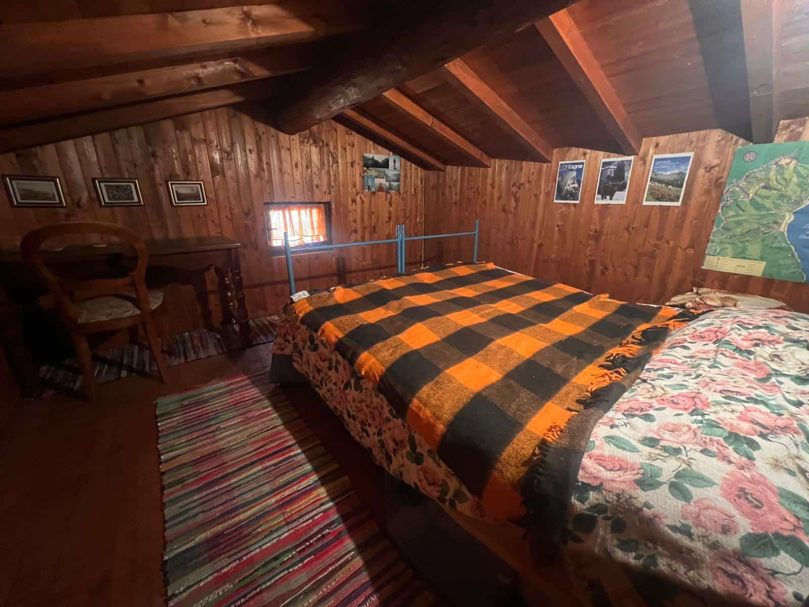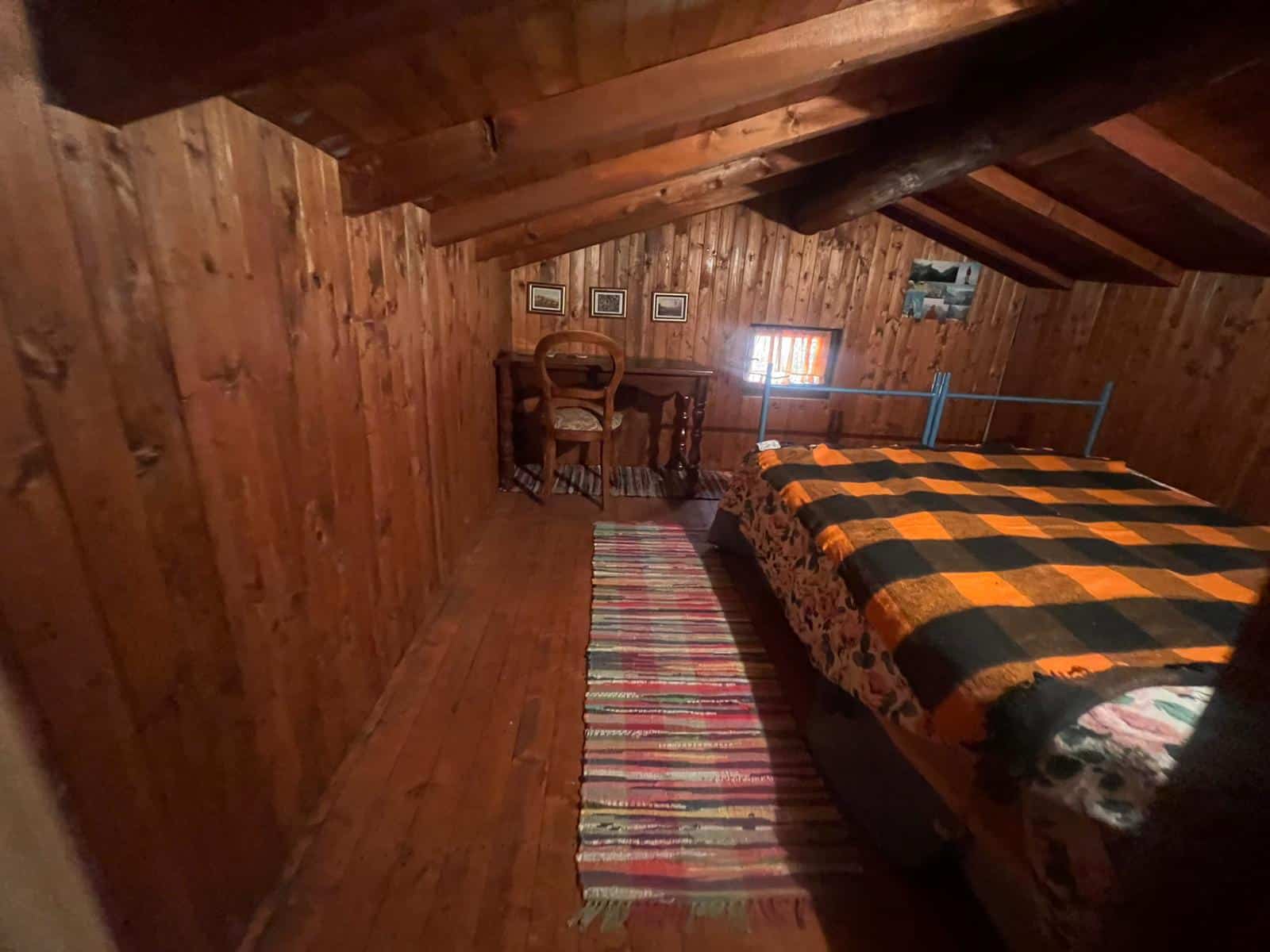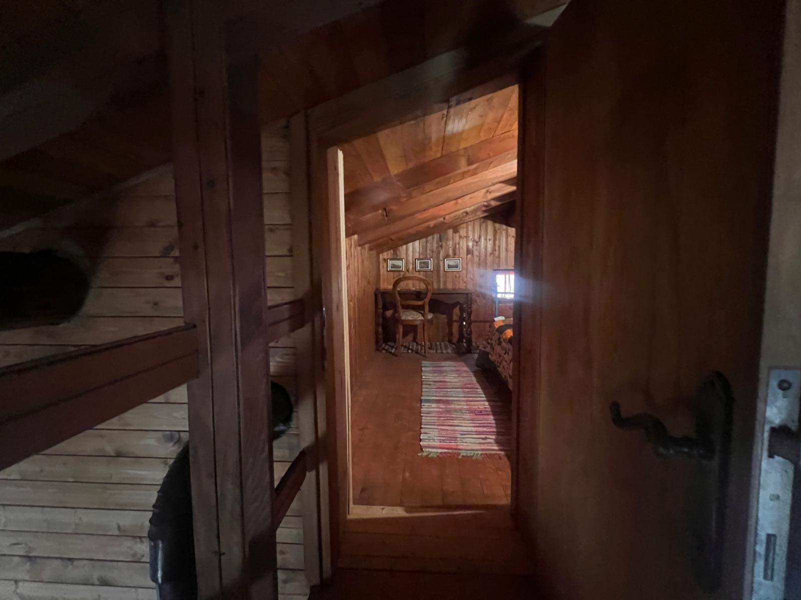 De ruime woonkamer met open haard van natuursteen en houten balkenplafond is het kloppende hart van het huis. Aangrenzend zijn meerdere slaapkamers, een keuken en een badkamer met bad en bidet. Vanuit de woonkamer met open haard is er directe toegang tot het overdekte terras met eettafel en ligstoelen om perfect te genieten van het panorama. Op de verdieping bevinden zich extra slaapkamers onder een authentiek houten dakgebinte, en een balkon met uitzicht over de bergen.