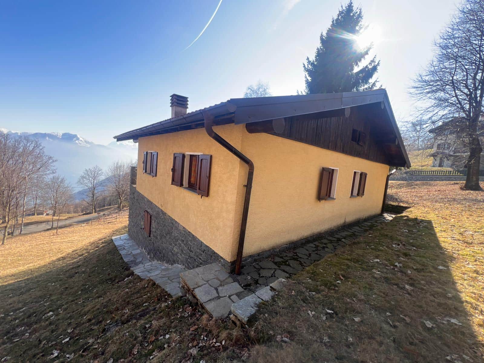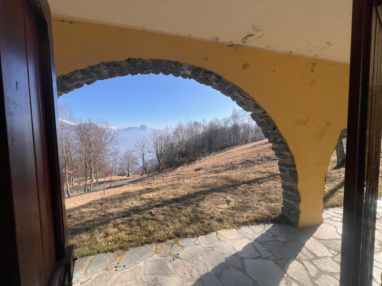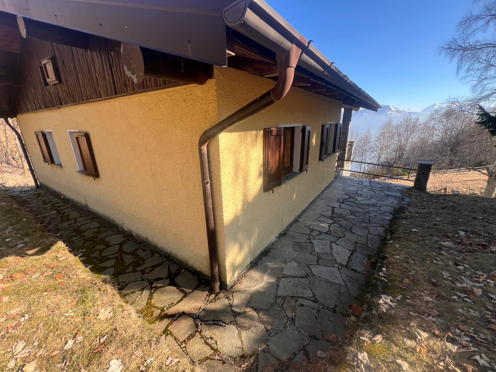 Hoog boven Garzeno, in de rustige località Baltrigo bij Germasino (Provincia di Como), ligt dit unieke chalet op een perceel van 1.000 m² met fantastisch uitzicht op de besneeuwde Alptoppen en het Comomeer.