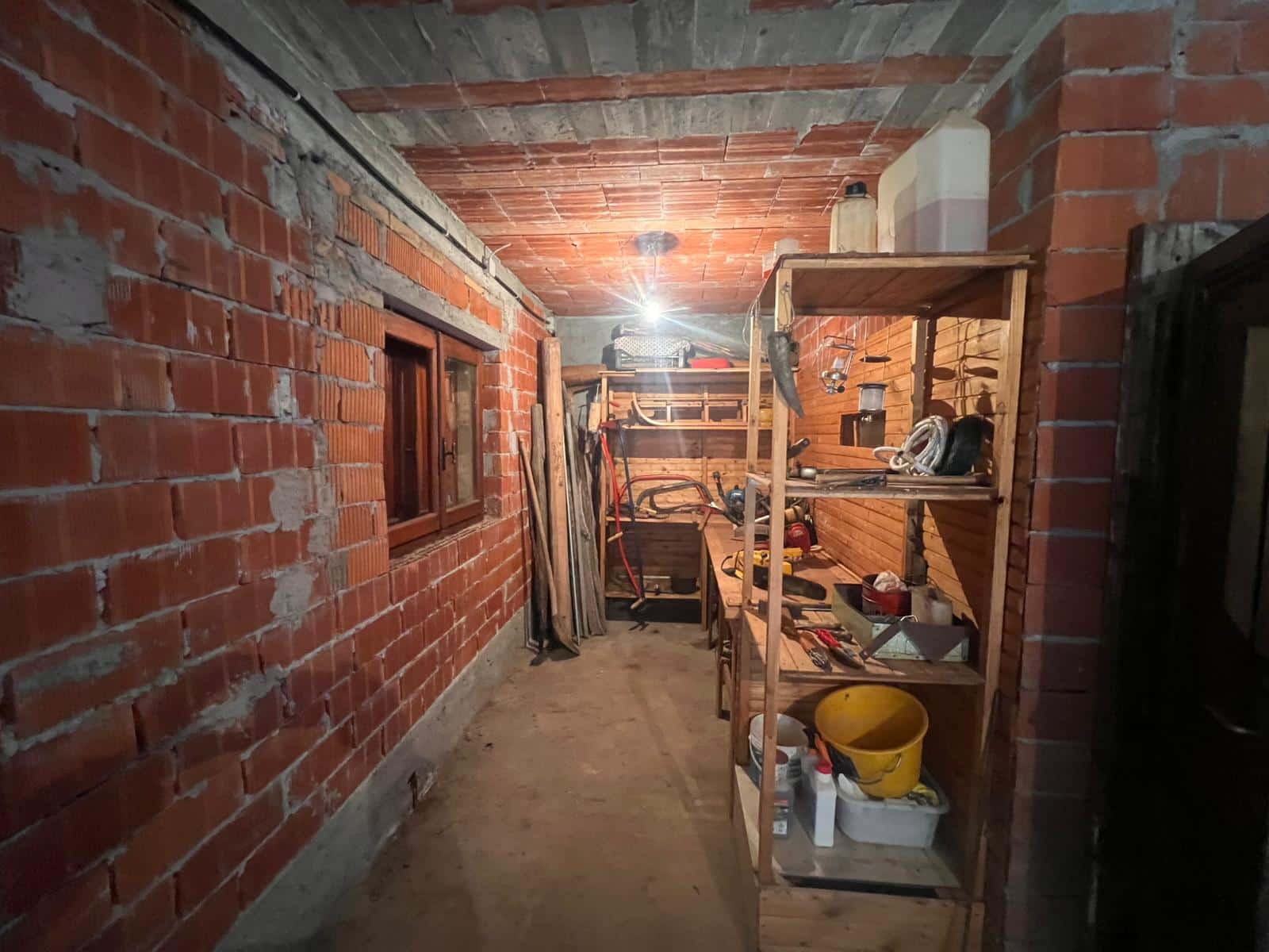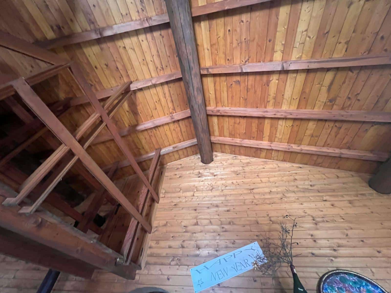 De stenen onderbouw biedt ruimte voor een werkplaats en opslagruimte voor hout en gereedschap. Het perceel van 1.000 m² is omgeven door weilanden en bosrand, met terrassen en paden van natuursteen.